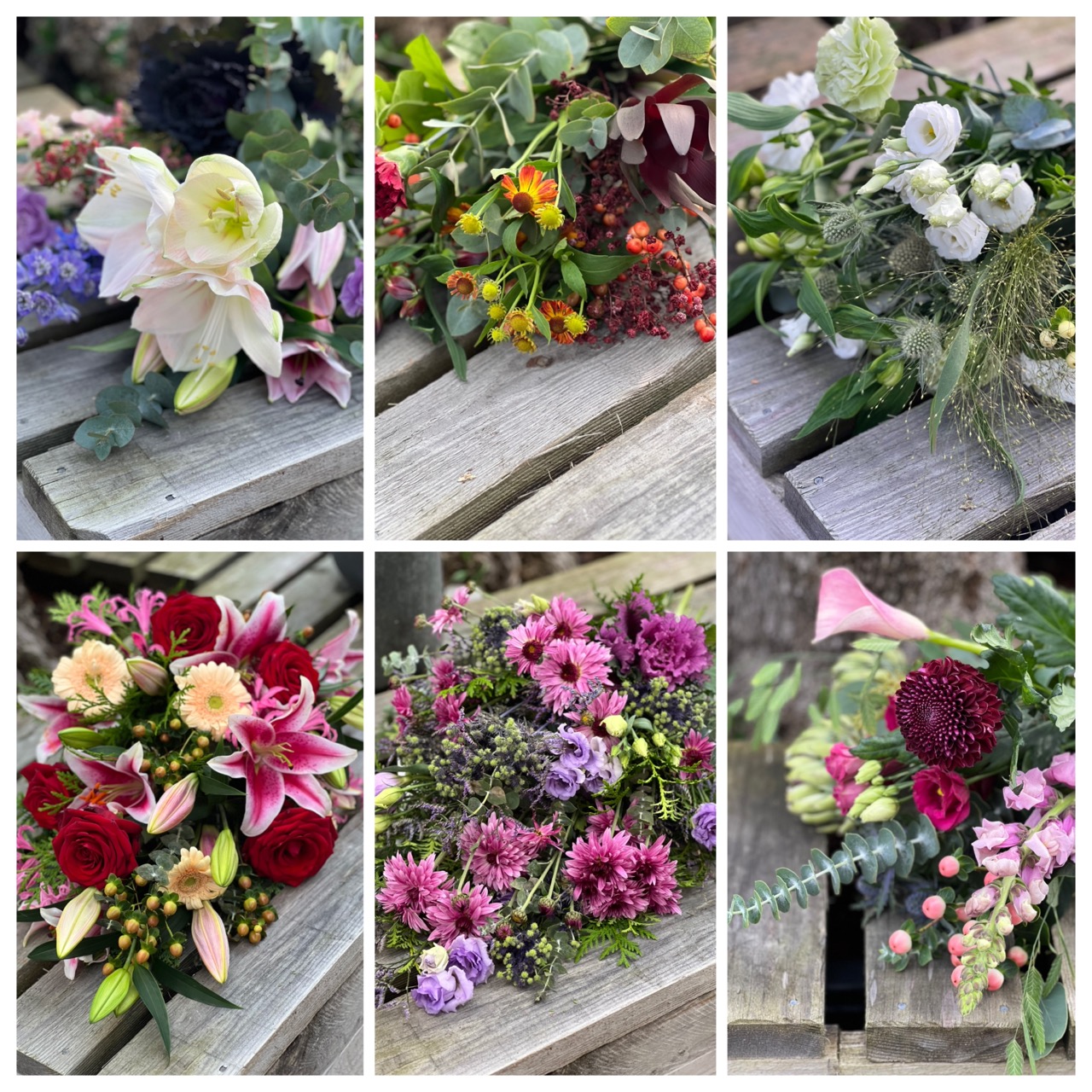 Priser fra til 200,- til 500,- Billedet viser eksempler på buketter.