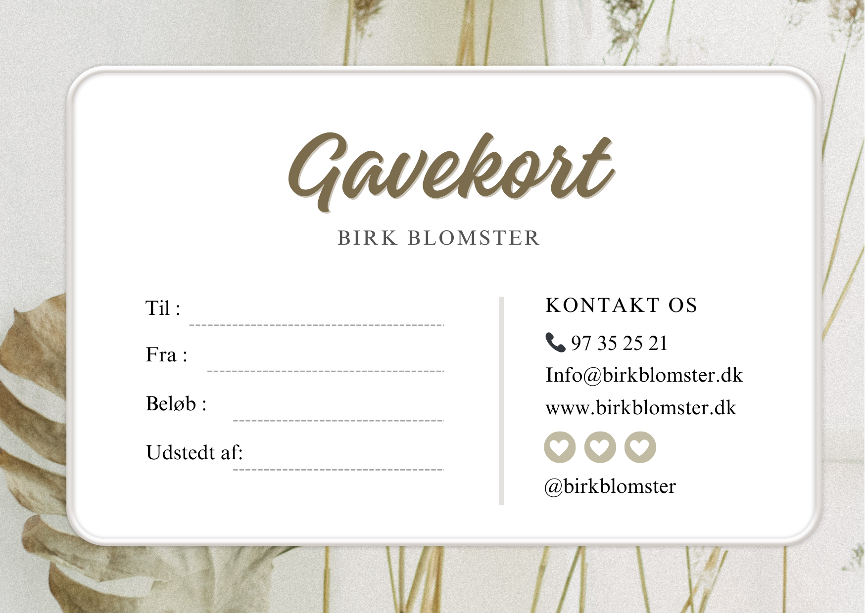 For at få udstedt dit gavekort beder vi dig kontakte os på telefon 97352521 eller e-mail info@birkblomster.dk.